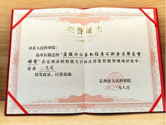近日,在定西市人民检察院举办的全市检察机关2023年度法律监督模型现场评比活动中,由漳县人民检察院报送的“虚假诉讼套取住房公积金法律监督模型”荣获二等奖。